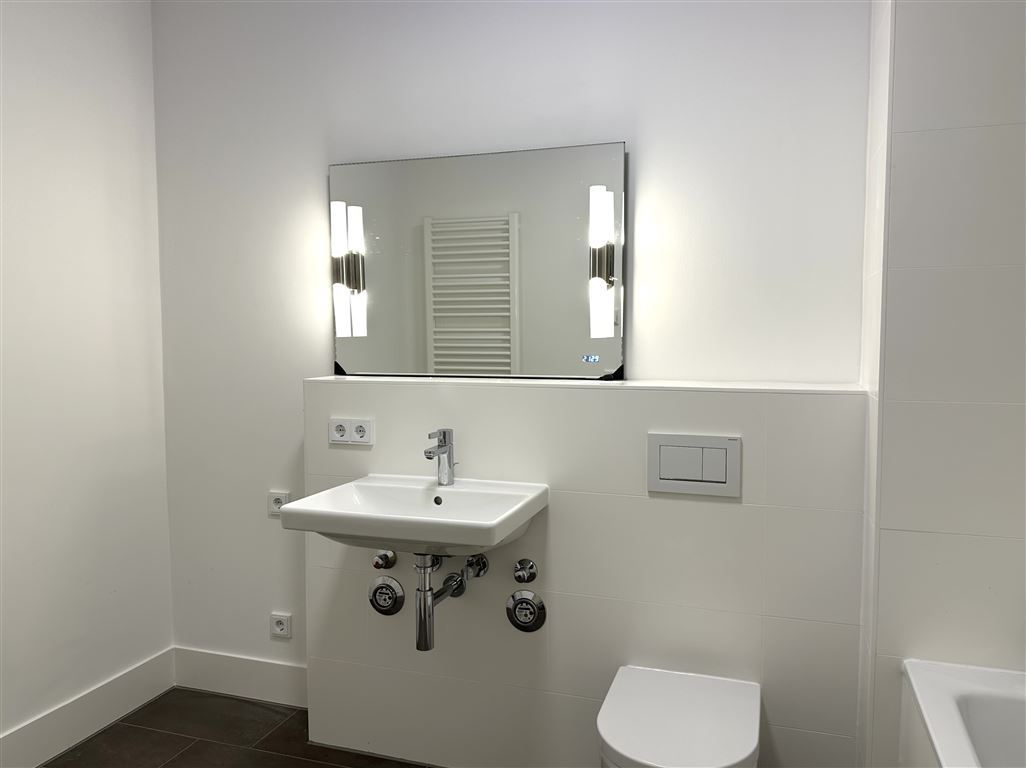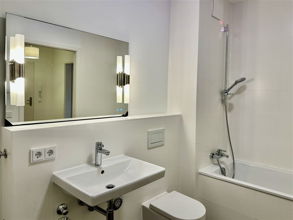 Direkt gegenüber der Eingangstür befindet sich das moderne Wannenbad,