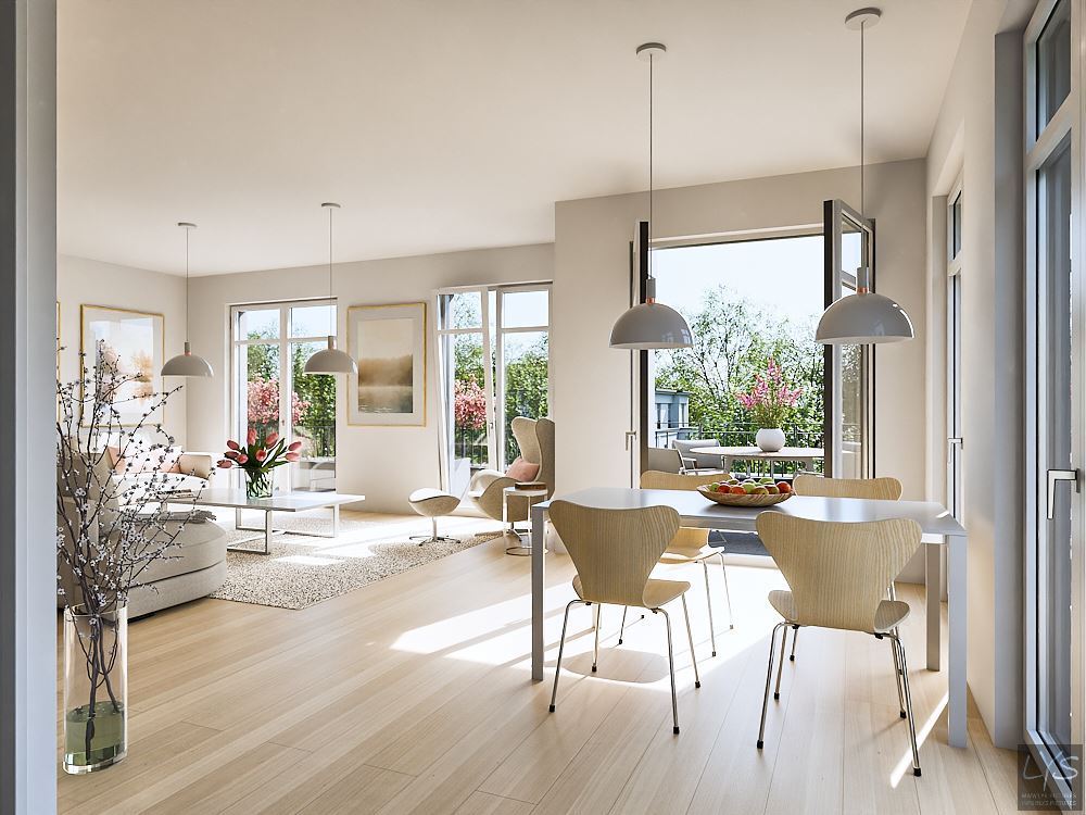Die vielen insbesondere nach Westen ausgerichteten bodentiefen Fenster sorgen für helle, lichtdurchflutete Räume.